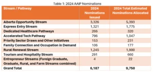 As of July 25, 2024, Immigration, Refugees and Citizenship Canada (IRCC) has set nomination limits for all provincial nominee programs. In 2024, AAIP received a total of 9,750 nominations across various streams. The following table summarizes the nominations issued and the total estimated nominations allocated for each stream: